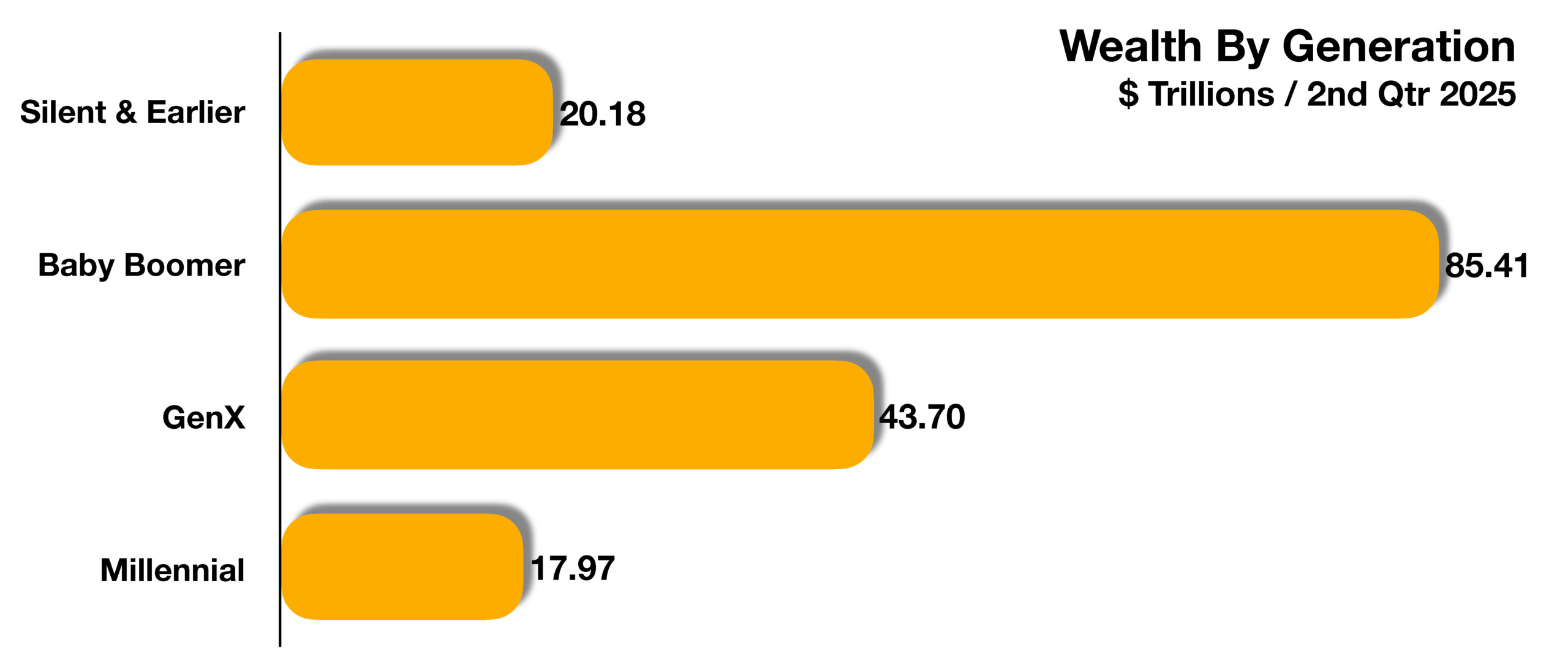 Baby boomers, those of us born between 1946 and 1964, currently hold the largest share of wealth in the U.S. stock market as compared to other age groups. As the biggest investors in stocks, there also comes some risks to the boomers. The median age of baby boomers is now over 60, not 36 when the internet bubble burst in 2000 or 43 in 2007 when the financial crisis began. Demographically, the boomers have more exposure now than in 2000 and 2007, because at age 60 boomers don’t have the time to make up significant market pullbacks as occurred in 2000 and 2008. With over 60% of their financial assets allocated to stocks, more boomers are reallocating some of their stock holdings to bonds in order alleviate risk exposure and market pullbacks. Total wealth held by baby boomers reached over $85 trillion in the 2nd quarter, which includes stocks, real estate and personal assets. Those born between 1928 and 1945 are known as the Silent generation, which have surpassed their earning years and are mostly spending their remaining wealth on retirement and health care. Millennials, born from 1981 to 1996 are known as more cautious investors, holding higher cash balances and maintaining relatively conservative portfolios compared to Gen X, yet gradually increasing their allocations to equities as their confidence grows and wealth accumulates.